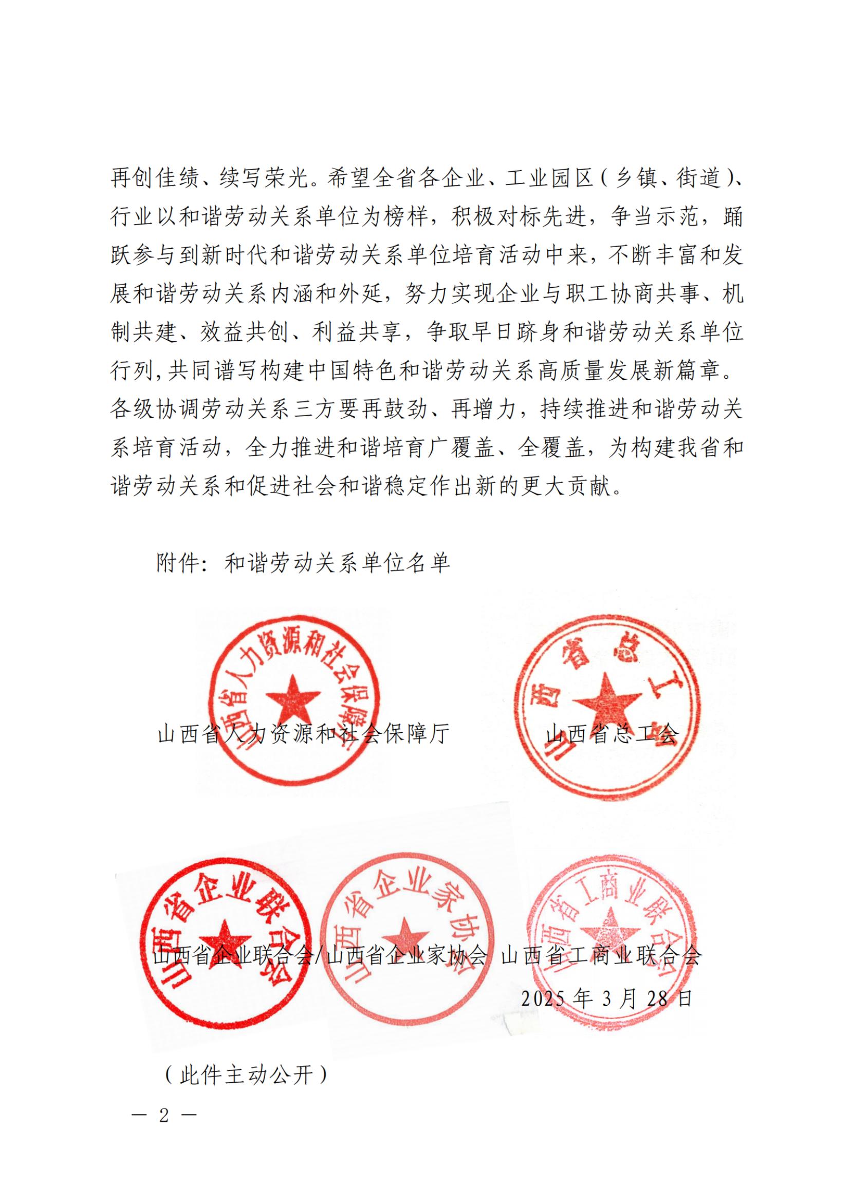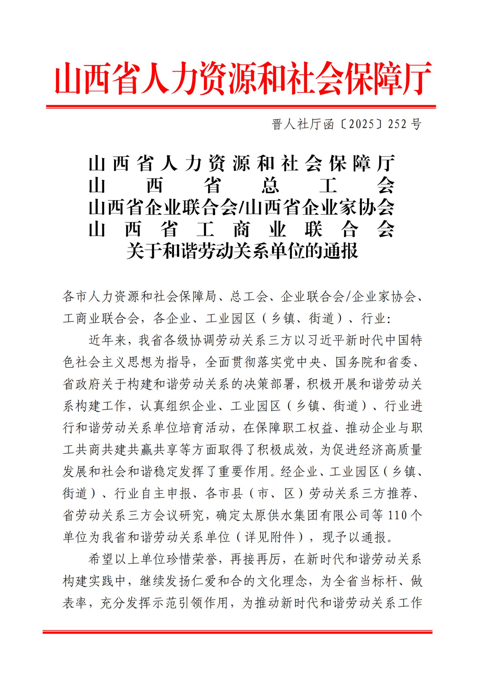 喜报丨集团荣膺山西省“和谐劳动关系企业”称号